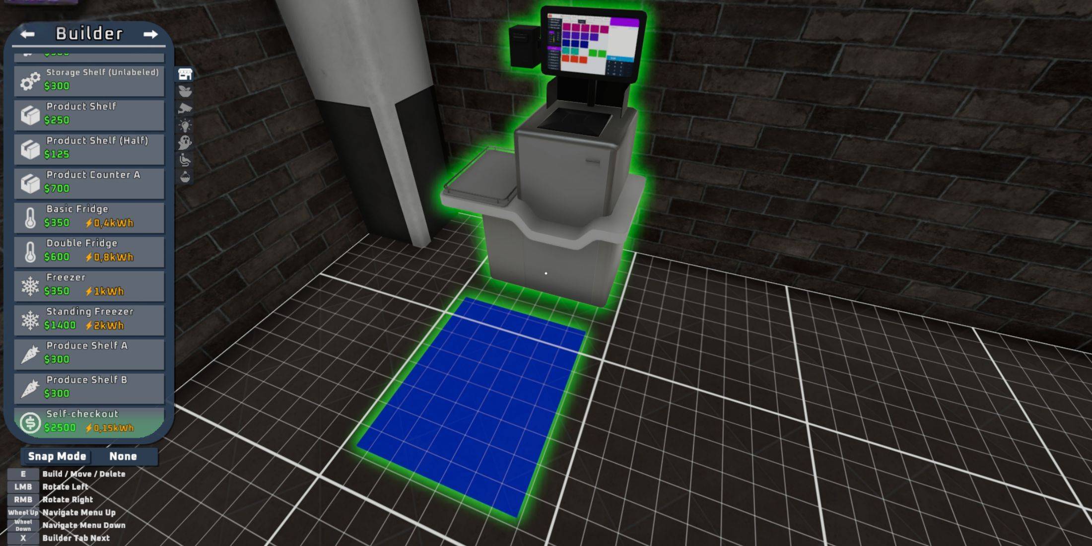 Der gemeinsame Aufbau eines Selbstprüfungsanschlusss im Supermarkt ist ein unkomplizierter Prozess. Ähnlich wie bei anderen Elementen im Spiel ist der Selbstprüfungsschalter über das Builder-Menü zugänglich. Drücken Sie einfach die Registerkarte auf Ihrer Tastatur, um darauf zuzugreifen, und scrollen Sie dann nach unten, bis Sie die Option zum Erstellen des Selbstprüfungsanschlusss finden.
