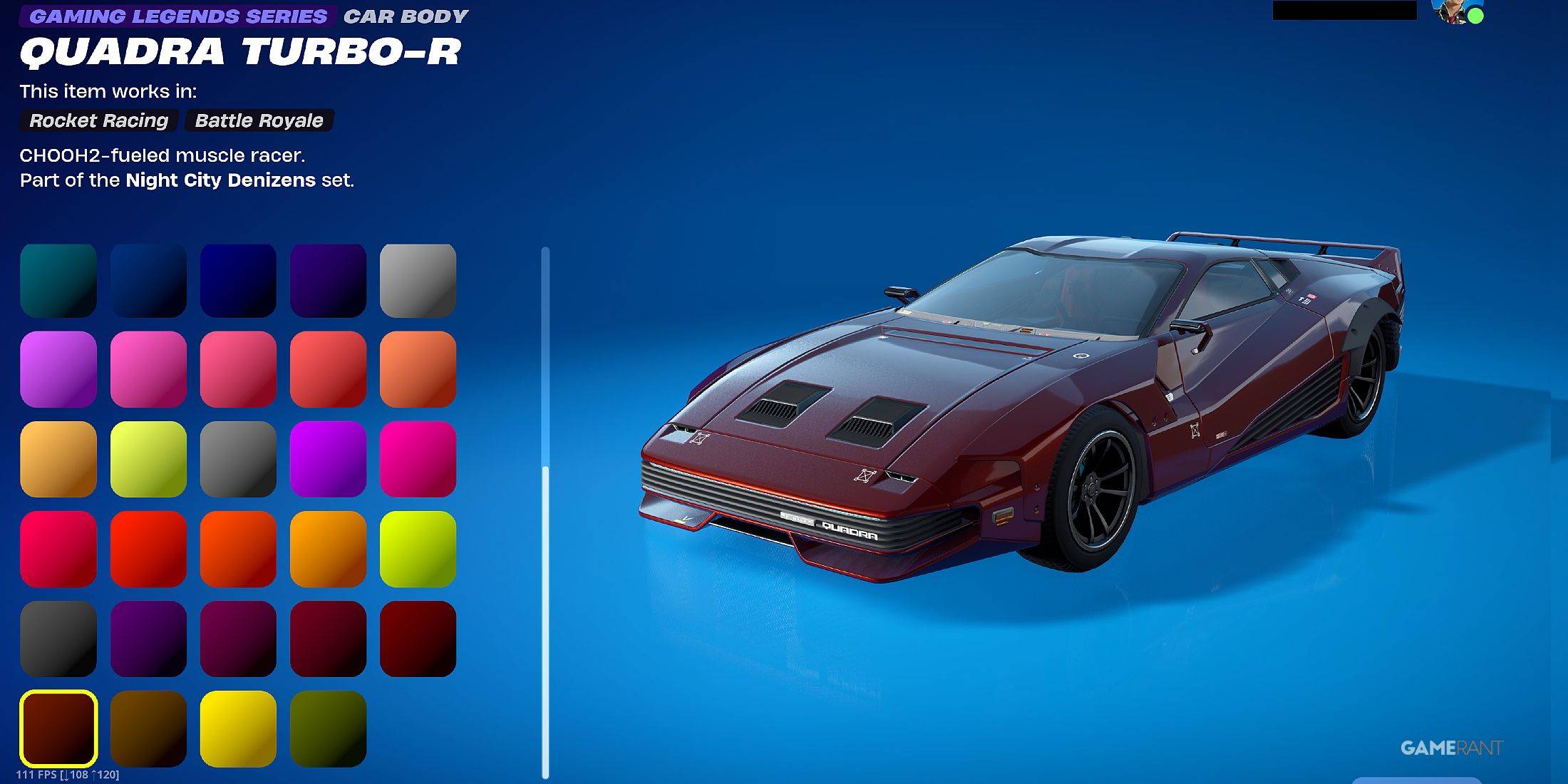Zusätzlich zum Quadra Turbo-R-Karosserie verfügt das Cyberpunk- Fahrzeugbündel mit einem Satz Räder und drei einzigartigen Abziehbildern: V-Tech, Red Raijin und Green Raijin. Der Quadra Turbo-R bietet auch 49 verschiedene Farbstile, sodass Sie Ihre Fahrt an den Inhalt Ihres Herzens anpassen können. Sobald Sie den Kauf getätigt haben, können Sie den Quadra Turbo-R als Sportwagen in Ihrem Schließfach ausrüsten und in Fortnite's Battle Royale und Rocket Racing Modi fahren.