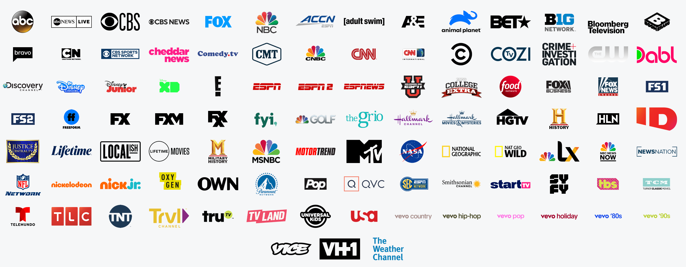 Hulu + Live TV bietet in seinem Basisdienst über 95 Kanäle an, darunter lokale Netzwerkerunternehmen und Nachrichten von ABC, CBS, FOX und NBC. Es verfügt außerdem über beliebte Kanäle wie Comedy Central, ESPN, FX, Food Network, Disney Channel, HGTV, The History Channel, ID, Lifetime, MTV, NFL -Netzwerk, Nickelodeon, Paramount -Netzwerk und mehr.