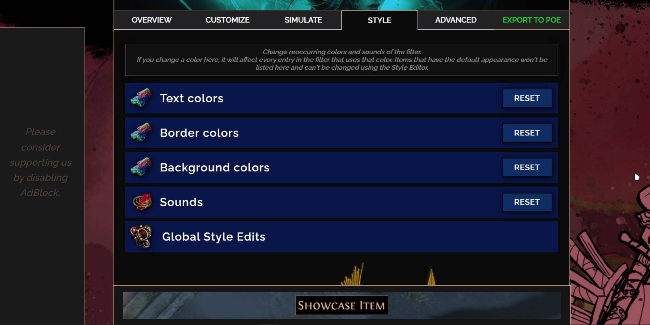 Für eine detaillierte Anpassung navigieren Sie zur Registerkarte "Anpassen" neben der Übersicht. Hier finden Sie jeden möglichen Tropfen in POE 2, der in Abschnitte und Unterabschnitte eingeteilt ist und umfangreiche Anpassungsoptionen bietet.