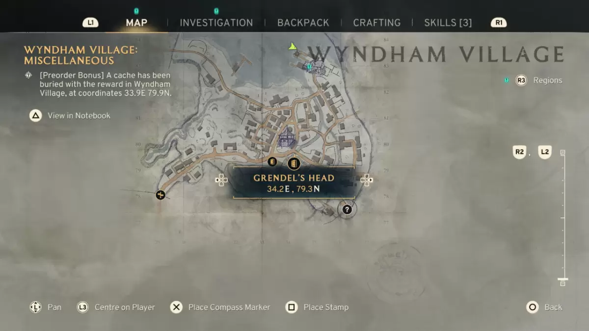 Um das "Enhanced Supply Bündel" -Paket vor dem ersten begrabenen Schatzvorrat zu sichern, fahren Sie in das Dorfgrün, nordwestlich von Grendels Kopf. Stellen Sie sicher, dass Sie das Lead verfolgen und seinen Standort auf Ihrem Kompass mit der Karte für eine einfache Navigation markieren.