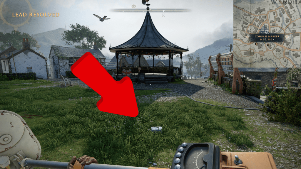 Sobald Sie das Dorfgrün erreicht haben, gehen Sie zur Südseite und klettern Sie die Treppe zum Denkmal. Verwenden Sie Ihren Metalldetektor, um den Bereich zu durchsuchen. Der Versorgungscache befindet sich vor der Bank links vom Denkmal, wenn sie sich ihm gegenübersieht. Im Inneren finden Sie 3 Trainingsstimulanzien, die Revolverwaffe des Überlebenden und 6 Pistolenmunition.