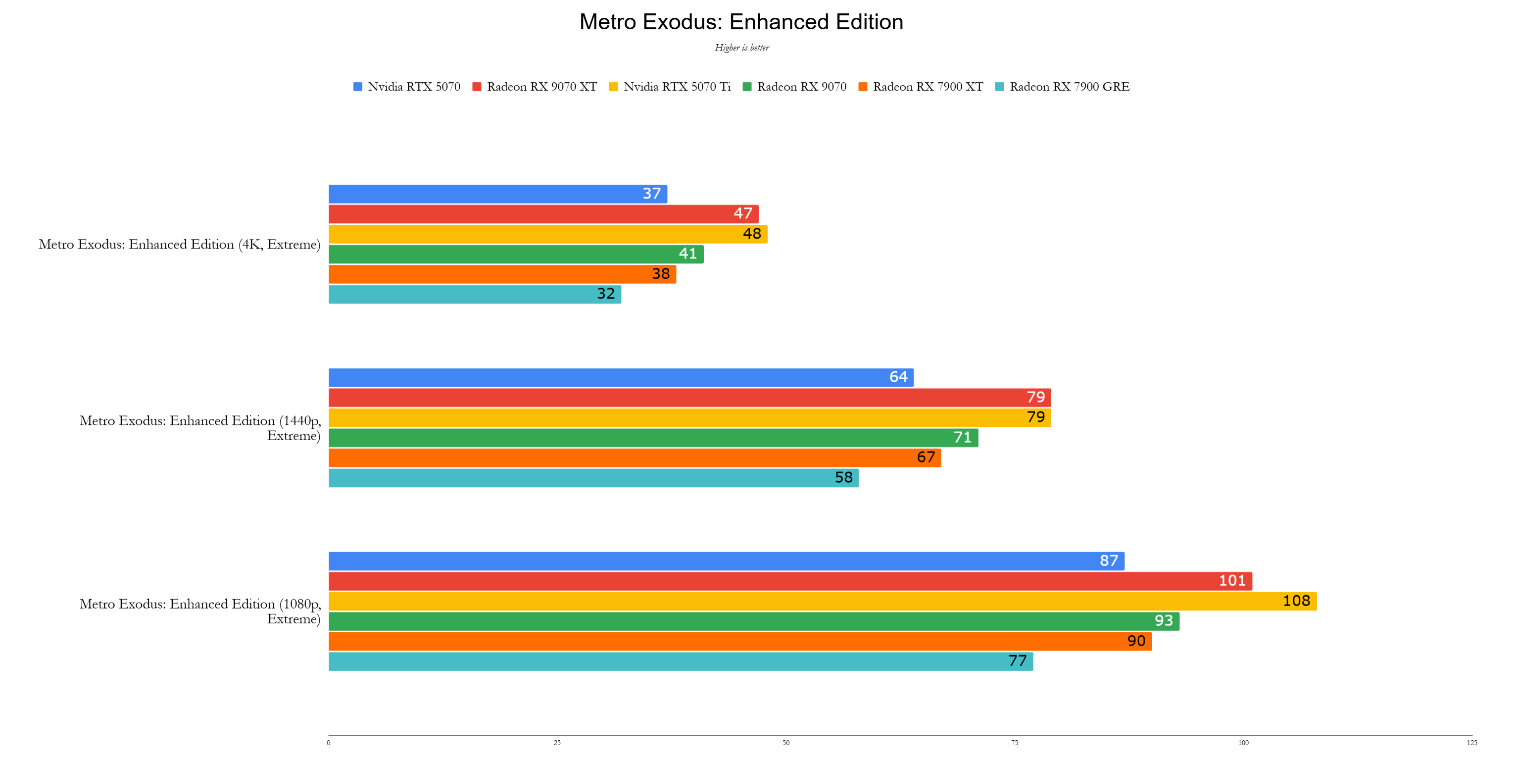 Der RTX 5070 TI führt in bestimmten Spielen wie Total War: Warhammer 3 an, wo es 87 fps bei 4K im Vergleich zum RX 9070 XT 76 fps erreicht. Im Durchschnitt war der RX 9070 XT jedoch 2% schneller, eine signifikante Leistung unter Berücksichtigung seines 21% niedrigeren Preises.