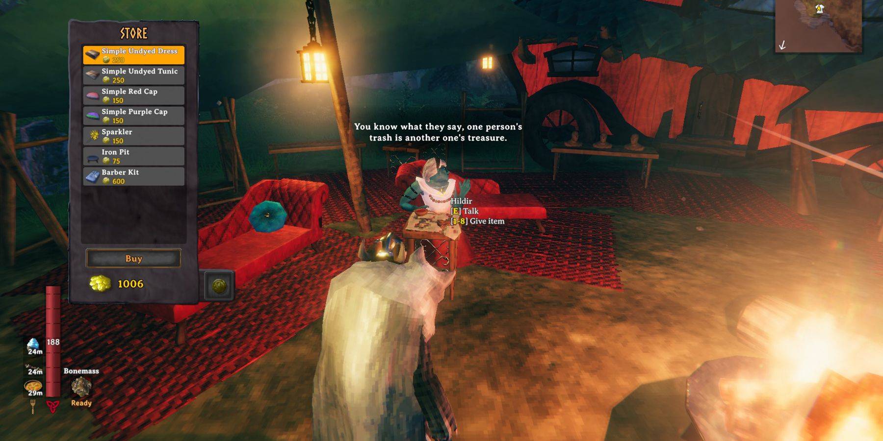 Hildir ist auf Kleidung spezialisiert, die verschiedene Buffs anbietet. Ihre Artikel bieten oft die gleichen Vorteile und ermöglichen es Ihnen, auf dem Stil zu wählen, ohne die Funktionalität zu beeinträchtigen. Darüber hinaus bietet Hildir Quests an, die Sie zu neuen Dungeons in verschiedenen Biomen führen, wie z. B.: