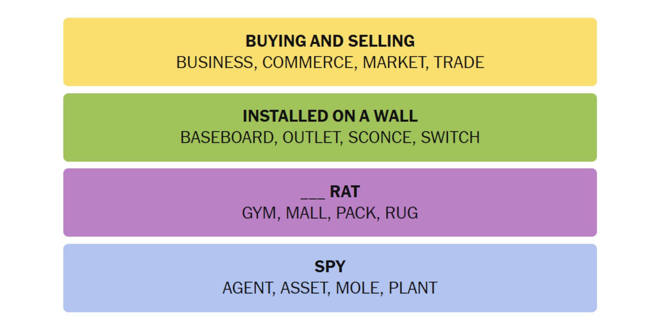 Für die lila/schwierige Antwort können alle vier Wörter das gleiche tierische Wort mit drei Buchstaben folgen, um gemeinsame Phrasen zu bilden.