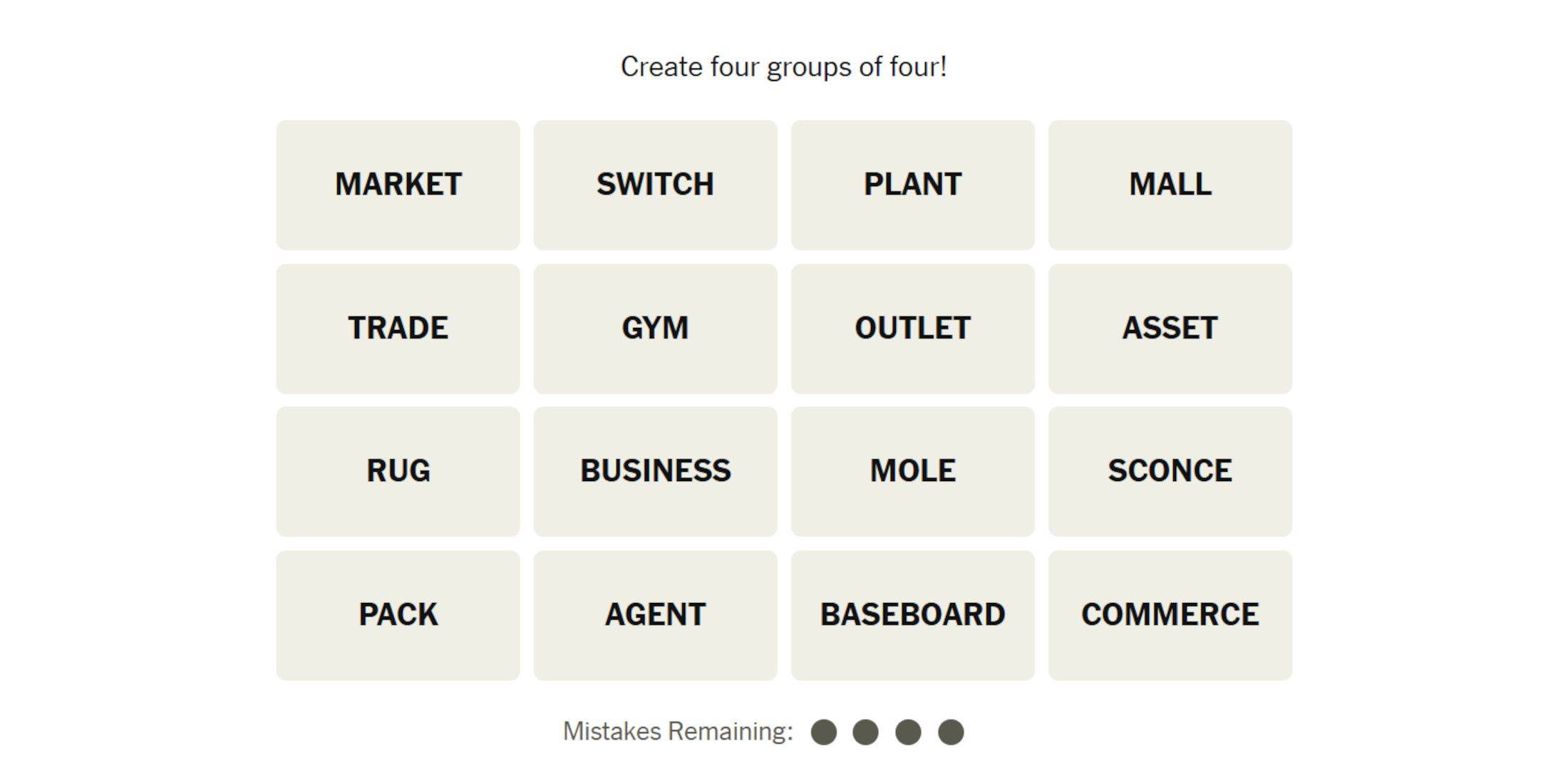 Das heutige Connections -Puzzle enthält die Wörter: Markt, Schalter, Pflanzen, Einkaufszentren, Handel, Fitnessstudio, Outlet, Asset, Teppich, Geschäft, Maulwurf, Pack, Pack, Agent, Baseboard und Handel.