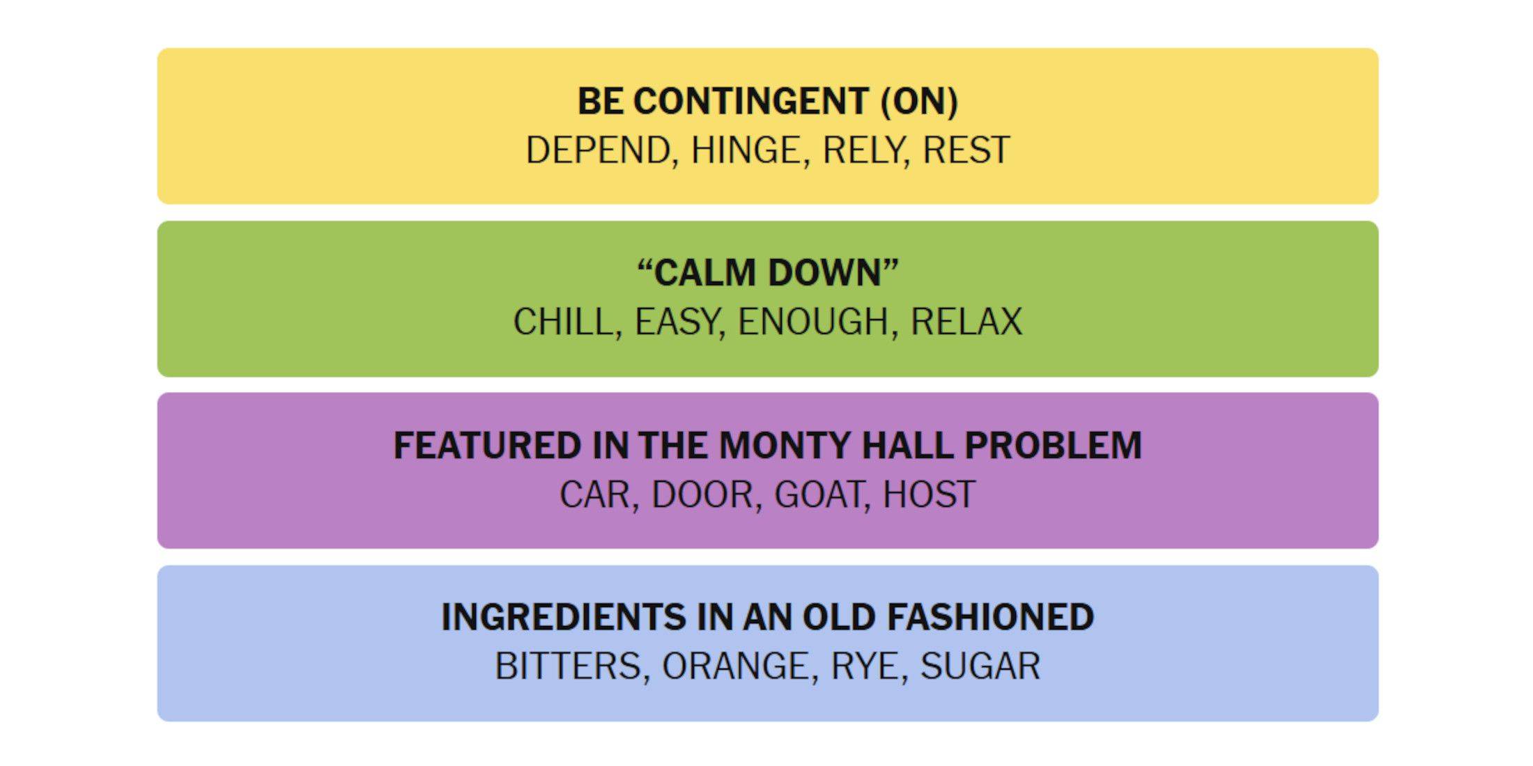 Le puzzle comporte quatre catégories. Vous trouverez ci-dessous des conseils et des réponses, séparés par des niveaux de difficulté codés par couleur :