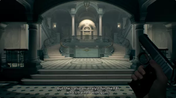 Another first-person sequence shows Ashcroft exploring a grand hallway, this time armed with a handgun—fitting for an FBI agent skilled with firearms. Her ability to "remain calm and use deductive reasoning" is also showcased, as she inspects a toolbox in Resident Evil's signature close-up style.
