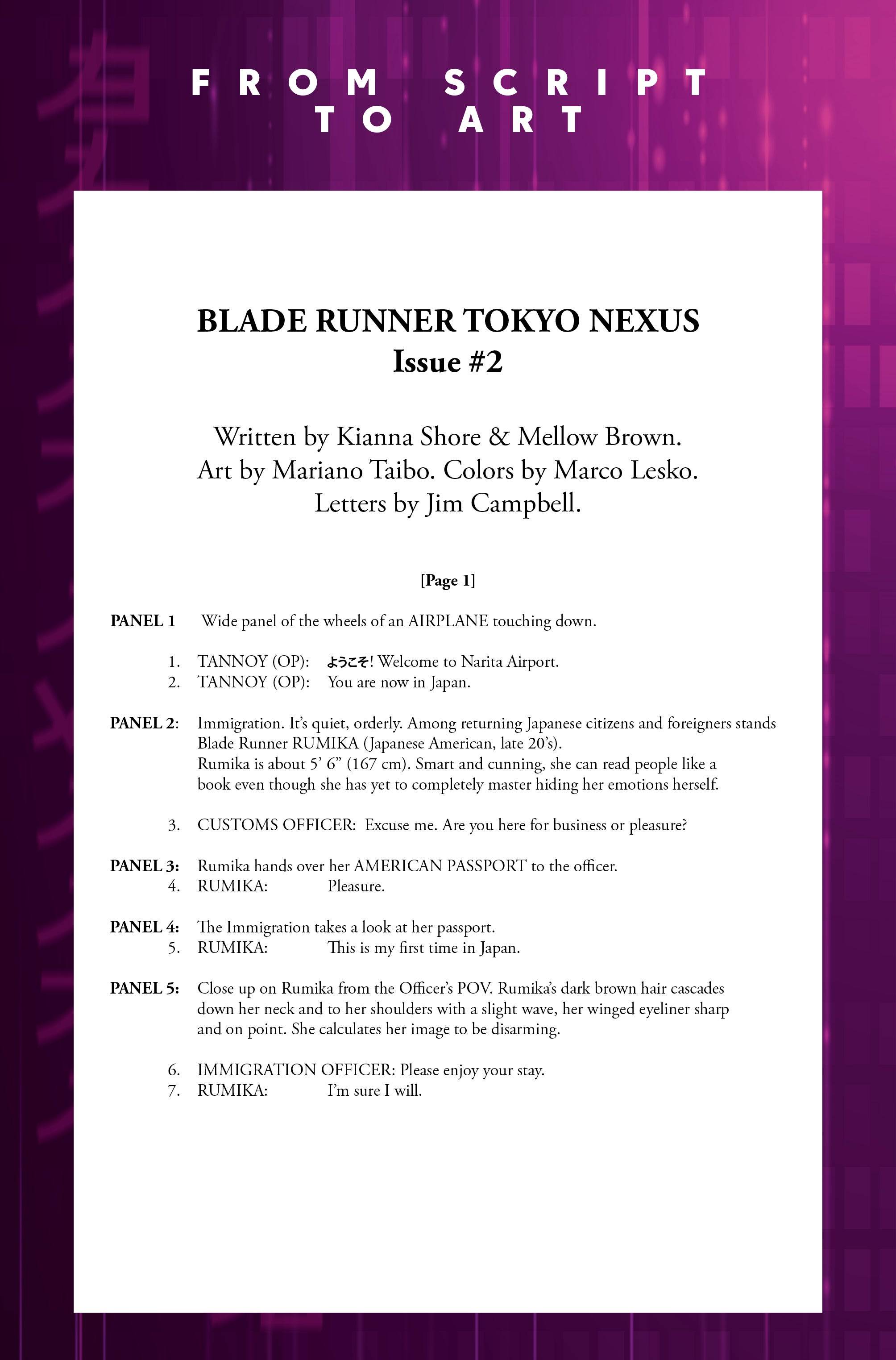 "* Tokyo Nexus* é um autônomo em cenário, tempo e história", diz Shore. "É claro que não seria o Blade Runner sem a aparentemente onipresente a Tyrell Corporation que influencia as ações dos personagens ou um mistério a resolver. Há alguns acenos divertidos e ovos de Páscoa que aludem aos filmes de corredores de blade, mas alguém sem conhecimento de BR também pode apreciar os quadrinhos".