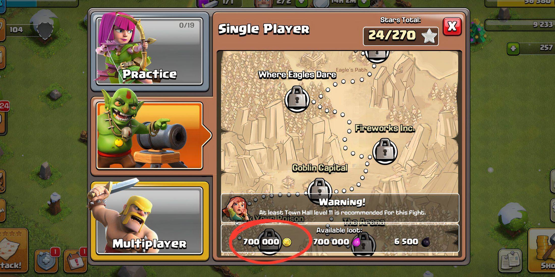 Одиночная кампания позволяет вам совершать набеги на деревни гоблинов и зарабатывать приличное количество золотых монет. Зачистка этих деревень откроет новые области с лучшей добычей. Однако, как только золото собрано, оно не восстанавливается, поэтому лучше сосредоточиться на новых областях, а не возвращаться к старым.