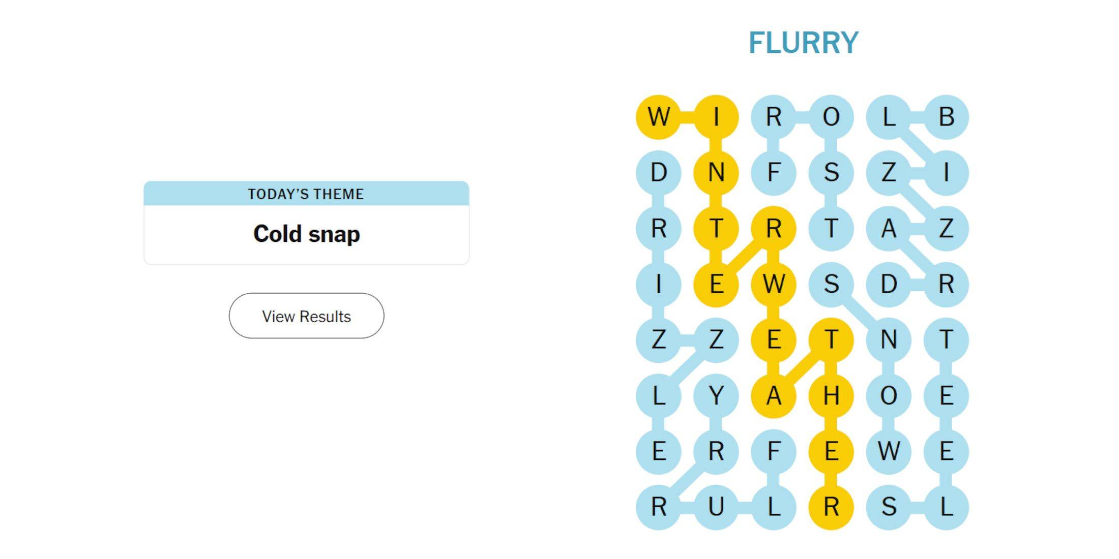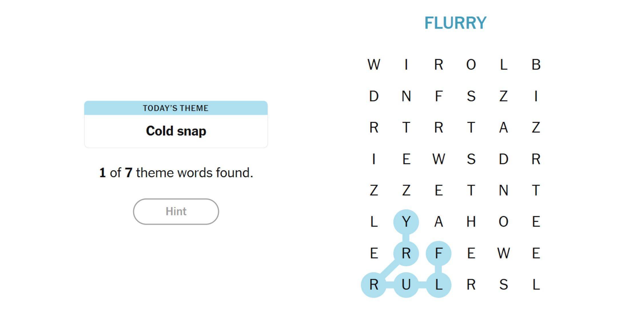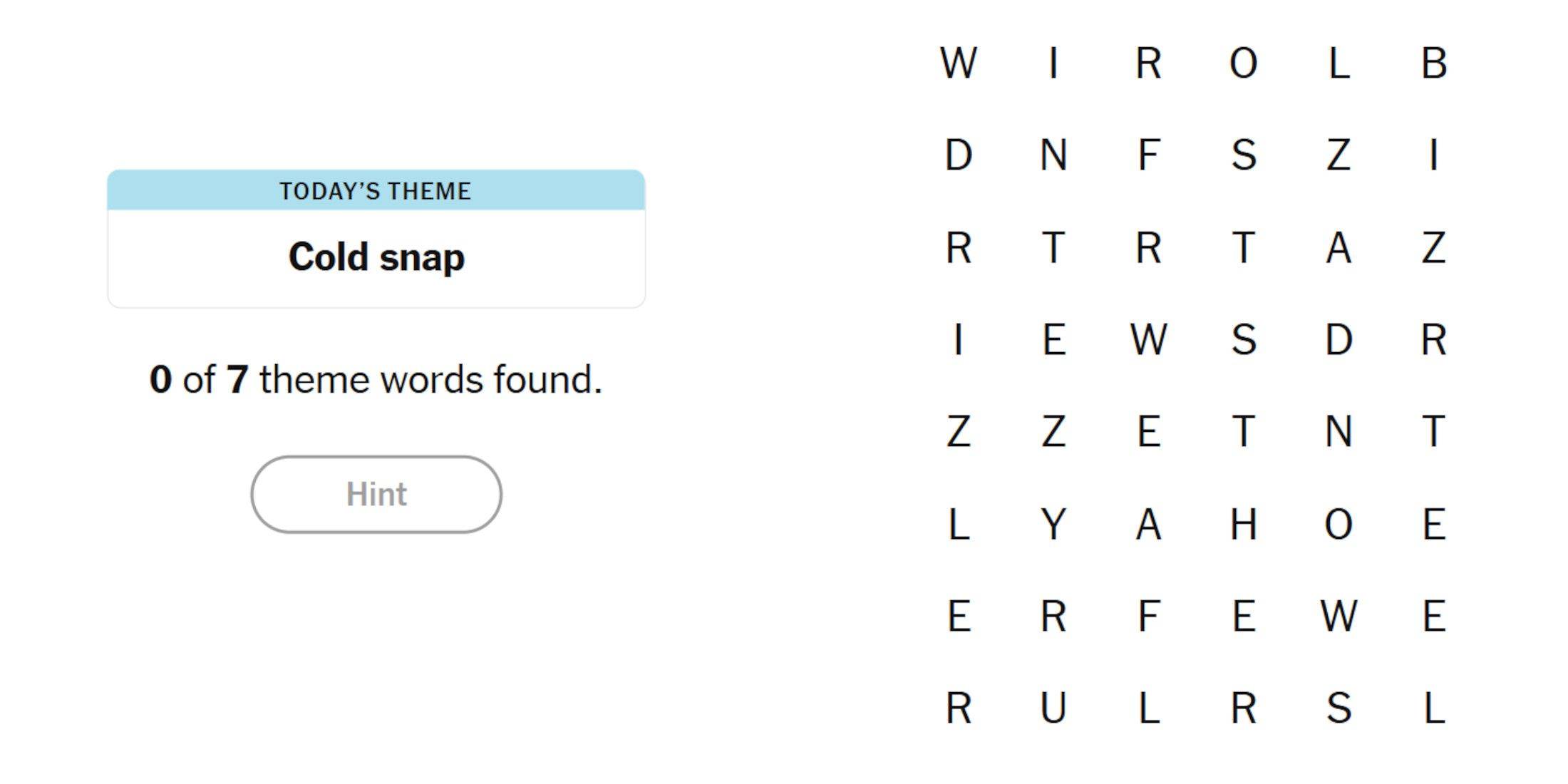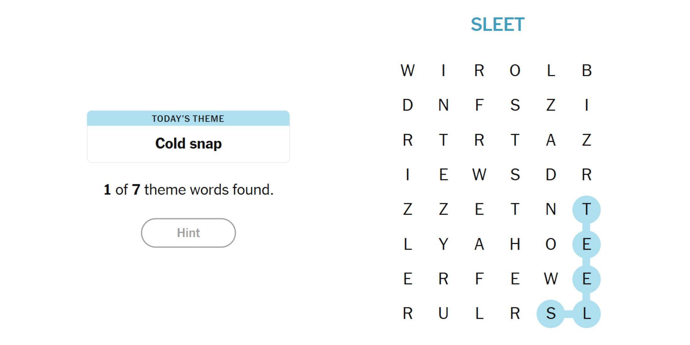 Сегодняшняя разгадка головоломки Strands — «Холодная хватка», которая содержит семь скрытых слов, включая панграмму (содержащую все слова из 26 букв) и шесть тематических слов.