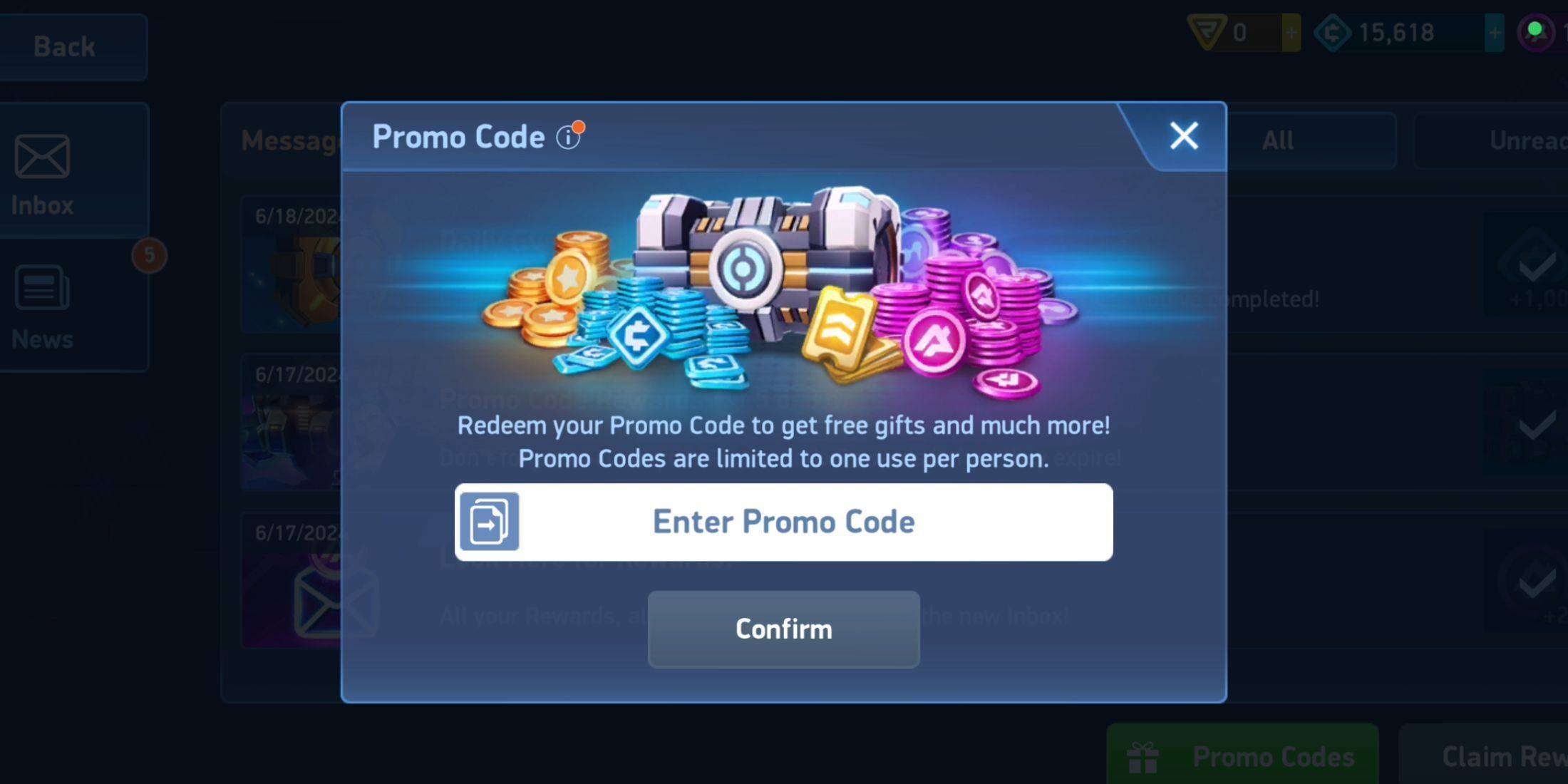 1。發射機械競技場。 2。在主菜單中,點擊信封圖標(郵件選項卡)。 3。導航到促銷代碼選項卡。 4。在指定的文本框中輸入代碼。 5。單擊“確認”以獲得您的獎勵。
