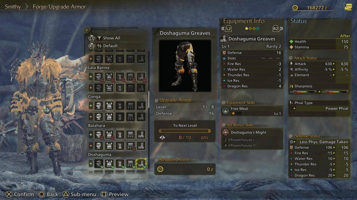 - Doshaguma Greaves:Doshaguma證書X1,Doshaguma Fur X2,Doshaguma Claw X1,Brute Bone X1