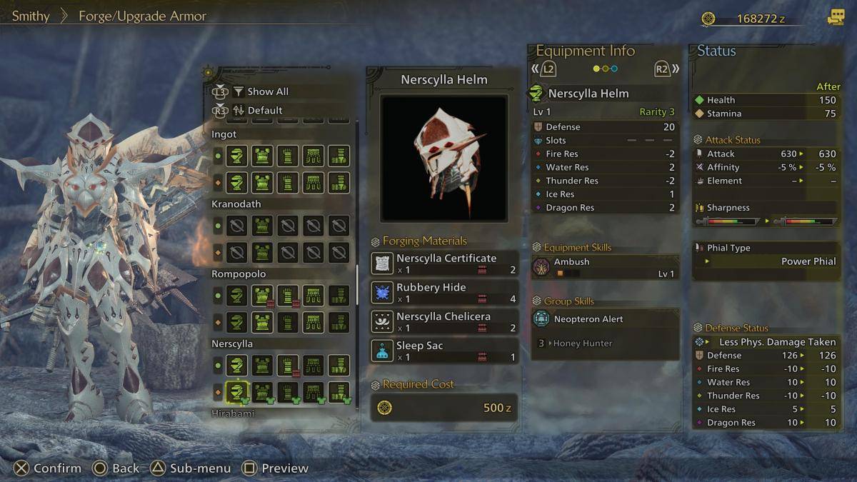 - Nerscylla Helm:Nerscylla證書X1,Rubbery Hide X1,Nerscylla Chelicera X1,Sleep Sac X1