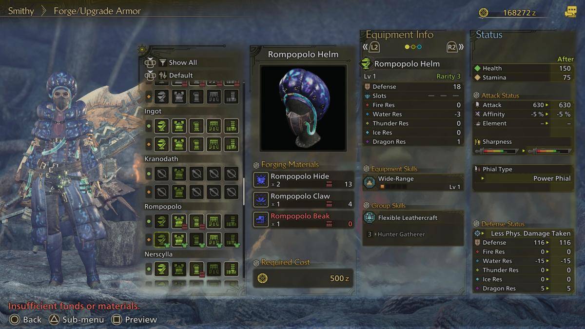 - Rompopolo Helm:Rompopolo Hide X2,Rompopolo Claw X1,Rompopolo Beak X1