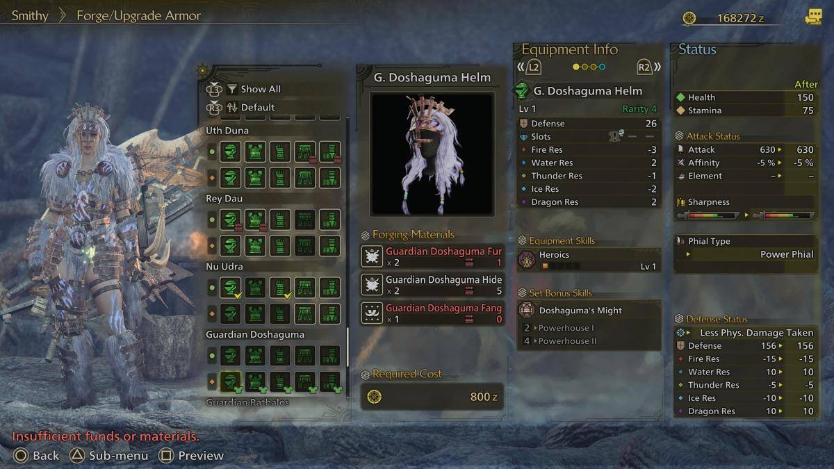 - G. Doshaguma Greaves:Guardian Doshaguma Claw X1,Guardian Doshaguma Fang X1,Guardian Pelt X1