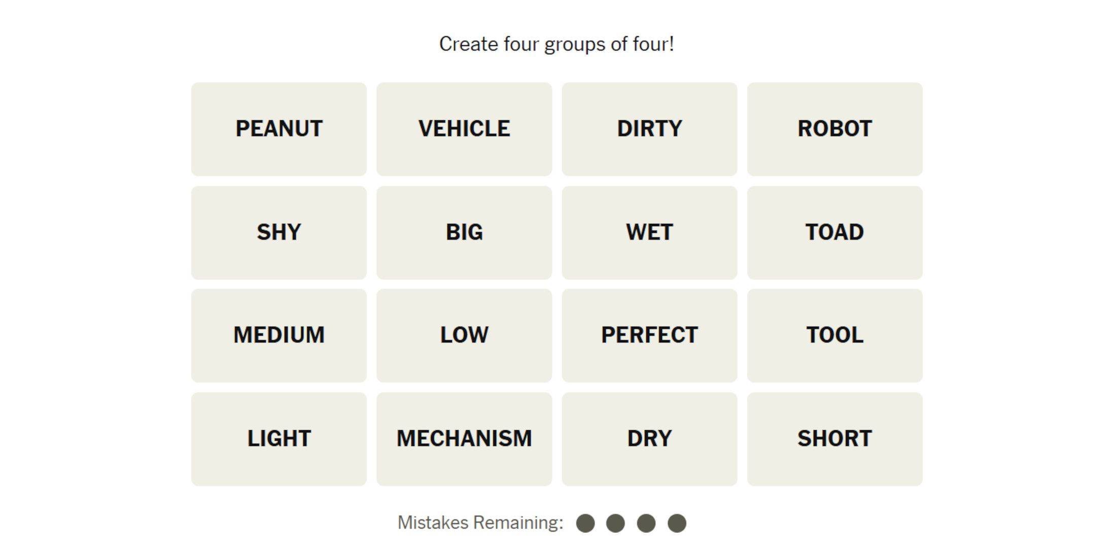 卡在NYT连接难题上?本指南提供了拼图#584的提示,解决方案和类别解释,其中包含:花生,车辆,肮脏,机器人,害羞,大,潮湿,湿,中,中,中低,低,完美,工具,轻,机械,机械,干燥和短片。
